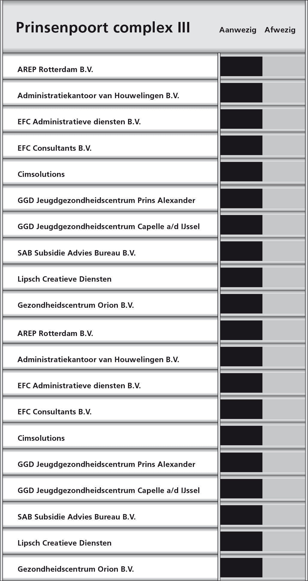 Dit presentiebord is ontworpen om de aanwezigheid van medewerkers van teamleden overzichtelijk weer te geven. Het bord bestaat uit een bovendien tekstpaneel van 62 mm hoog voor de kopregel, aangevuld met een flexibel aantal tekstpanelen van 31 mm hoog voor elk personeelslid. Elk naamvak bevat een schuifpaneel waarmee de status “Aanwezig” of “Afwezig” eenvoudig kan worden aangegeven. De namen kunnen op het bord worden aangebracht door middel van duurzame foliebelettering of een verwisselbare papierinleg, wat een snelle en eenvoudige aanpassing mogelijk maakt.