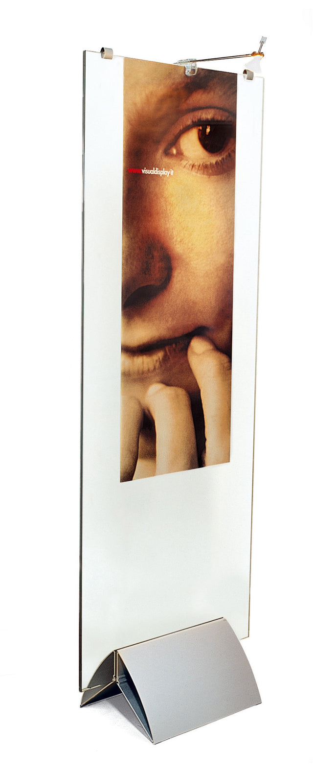De zuil bestaat uit één enkele glasplaat, veiligheidsglas, dikte 10 mm. De glasplaat wordt gemonteerd tussen een dubbelzijdig, in een hoek gezet, vlakke voet van geanodiseerd aluminium dmv 3 RVS nokken. De voet heeft een breedte van 400 mm. De glasplaat kan met folie worden voorzien van de gedeeltelijke tekst en/of logo.