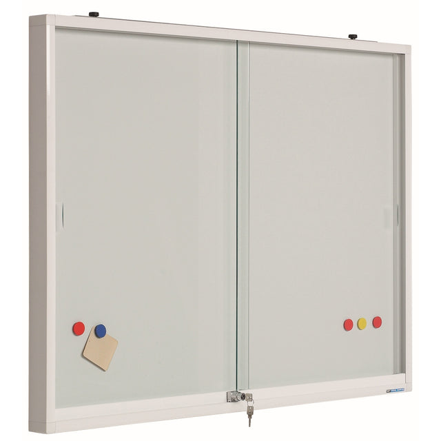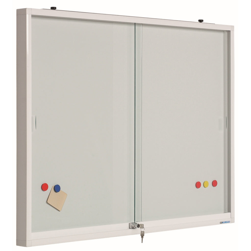 Binnenvitrine (wit) voor tentoonstelling achter glas of plexiglas. Deze Binnenvitrine is gemaakt van een zeer hoge kwaliteit geanodiseerd aluminium. Het frame en glas/plexiglas schuifdeuren zijn stevig en daarom geschikt voor intensief gebruik. De vitrine is te vergrendelen met een slot om de inhoud te beschermen. Achterwand uit wit emailstaal (magneet houdend en droog uitwisbaar).